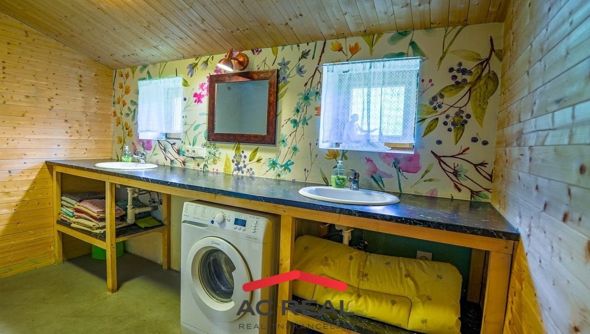 Dispozice a vybavení: Chalupa nabízí dvě obytná patra s celkovou užitnou plochou 187 m². Vstupní veranda s praktickým dřevníkem vede do prostorné haly. Po levé straně se nachází samostatné WC a vstup do velké koupelny, vpravo je kuchyně s původními kachlovými kamny, která navazuje na obývací pokoj s krbovými kamny a schodiště do horního patra. V patře je otevřený prostor společné ložnice o velikosti 69 m². Hala, koupelna i WC jsou vybaveny podlahovým vytápěním.